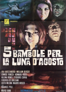 5 bambole per la luna d’agosto – Five Dolls for an August Moon (1970). Niemalże rajska wyspa, bajeczna willa usytuowana na brzegu i zamożny gospodarz, który zaprosił swoich równie majętnych gości. Wśród nich profesor, twórca formuły, która może zrewolucjonizować przemysł, a która to jest w chwili obecnej najbardziej pożądaną na wyspie rzeczą. Podczas frywolnych zabaw, lejącego się szampana i spadającego na dywan kawioru zaczynają się podchody kolejnych zaproszonych z grubymi portfelami. Podchody w różnych konfiguracjach, pojedynczo, dwójkami, z wypisanymi czekami, czy nawet groźbami. Takie jest tło, ale esencją jest morderstwo jednego z gości, a za nim kolejne i kolejne. Największym atutem produkcji jest damskie towarzystwo pląsające w willi. Urodziwe włoskie aktorki stanowią przyjemny ozdobnik tego bądź co bądź niemrawego dziełka. Jest więc okrzyknięta mianem sex bomby Edwige Fenech, piękna Ely Galleani (aktorka z polskimi korzeniami), czy pochodząca z rodu książęcego, zjawiskowa Ira von Fürstenberg. Jednak ikry tu tyle, co nic. Nie ma potrzebnego napięcia, widz nie uczestniczy w zagadce, bo ta jest prowadzona kuriozalnie (reakcja gości jest odwrotnie proporcjonalna do zwiększającego się zagrożenia, bo trzeba przyznać, że tajemniczy morderca zbiera krwawe żniwo dość sprawnie). Jednak tam, gdzie niedomaga scenariusz (chociaż podstawą było