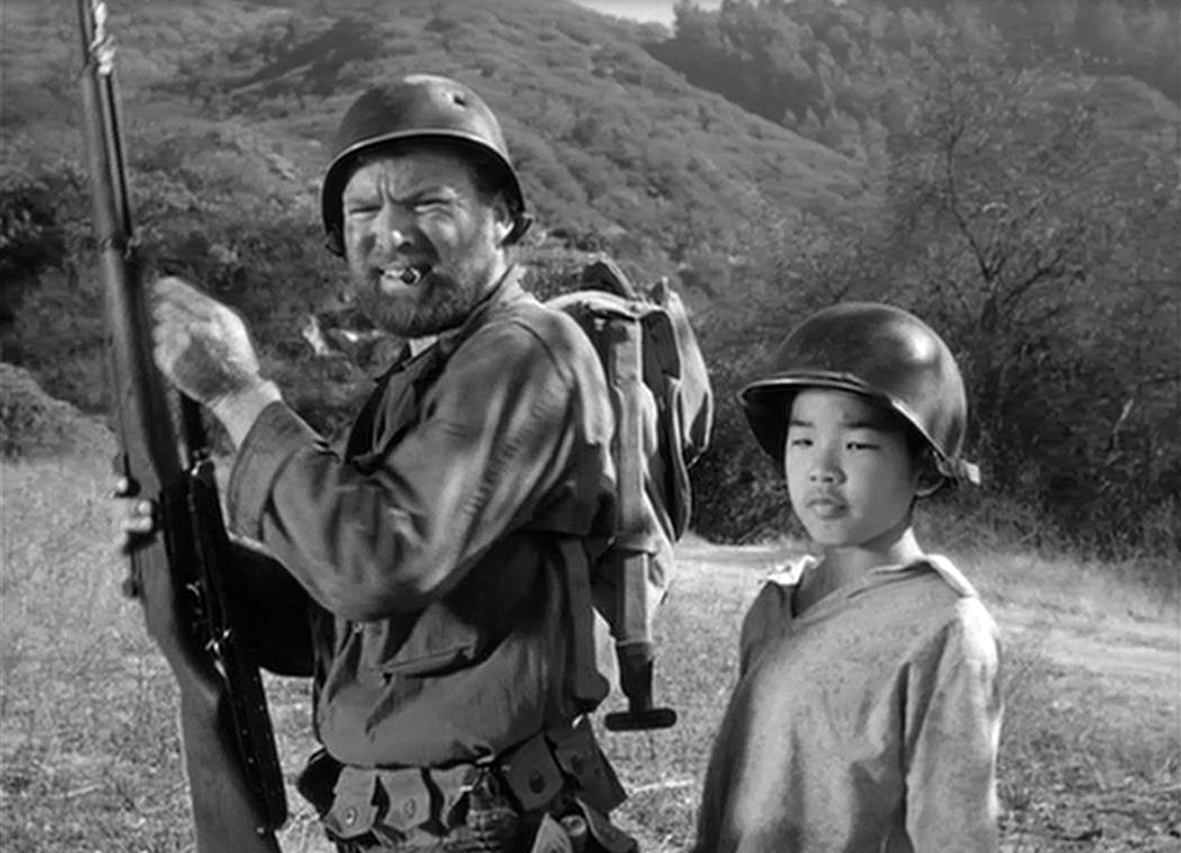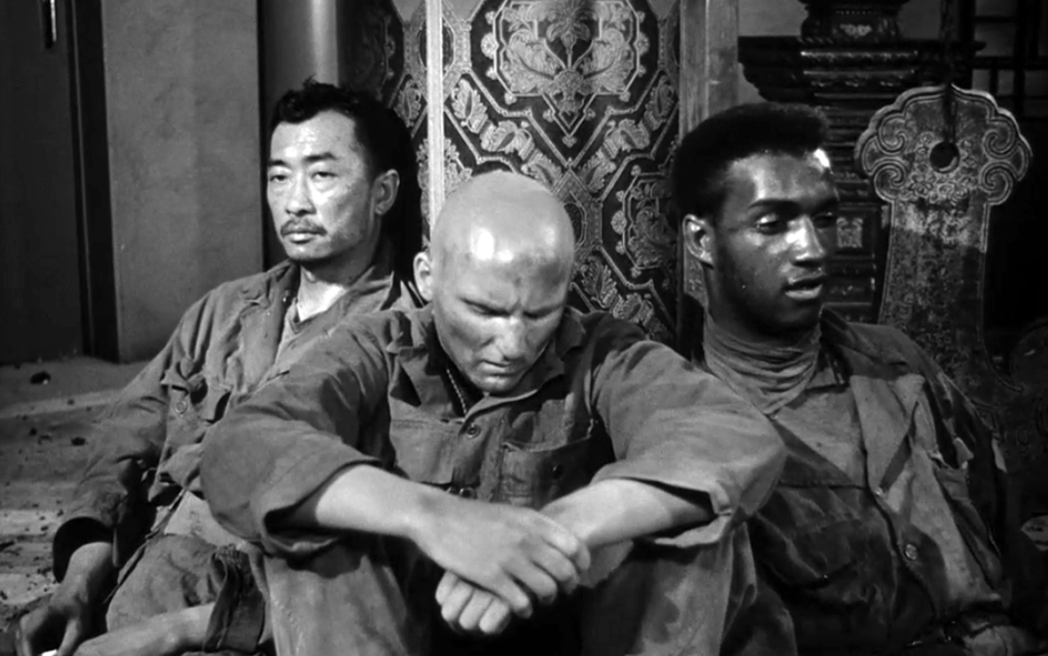 O takich tytułach słusznie pisze się „mały, wielki film”. W swoim trzecim pełnometrażowym filmie Fuller oddaje cześć amerykańskiej piechocie. Sam służył jako kapral w Pierwszej Dywizji, więc temat poznał z autopsji. Tym razem twórca uczynił głównym bohaterem sierżanta Zacka (Gene Evans). To twardziel (z tego filmu pochodzi kwestia „If you die, I’ll kill ya!„), a wojna koreańska jako tło wydarzeń nie jest pierwszym wojennym konfliktem, w którym sierżant bierze udział. Od pierwszych scen (notabene bardzo ciekawych, bo Fuller idealnie żongluje nastrojami widzów) zdajemy sobie sprawę, że żołnierz piechoty poradzi sobie w każdej sytuacji. Skrępowany leży wśród rozstrzelanych towarzyszy broni. Tak zaczyna się historia Zacka, który chce powrócić do jednostki. Pomaga mu czarnoskóry sanitariusz i rdzenny mieszkaniec terenów, na których toczy się wojna – chłopak, żarliwy wyznawca nauk Buddy. Po drodze dołączy jeszcze zagubiony, przetrzebiony amerykański oddział. Dzisiaj, patrząc na złożoną do kupy jednostkę mógłby powiedzieć multi-kulti, Fuller mówi: „patrioci, sól mojej ziemi”. Nieważne jest tu wyznanie, przeszłość, przekonania. Ważna jest flaga, której służysz, narodowość wbita w dokument tożsamości.