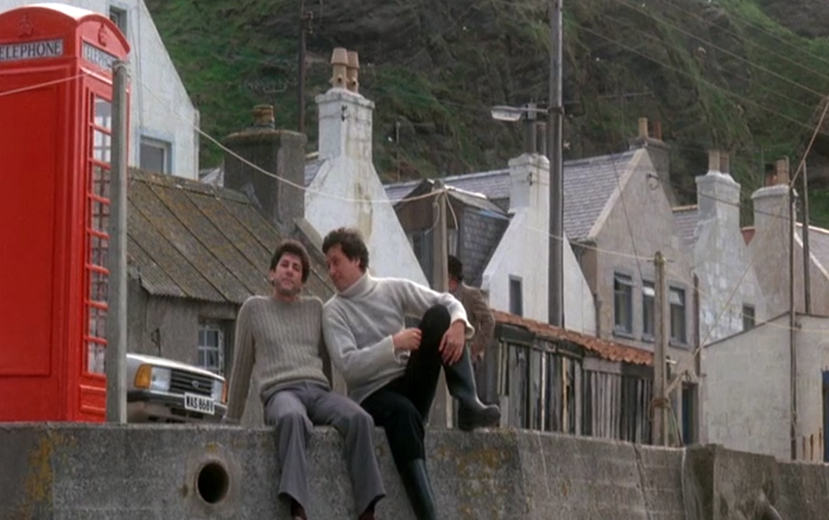 To ciekawe jak Bill Forsyth rozłożył perspektywę na dwie strony przy postrzeganiu tego samego miejsca. W momencie, gdy wjeżdżamy na szkockie pustkowia z dwójką bohaterów (Mac dostał do pomocy młodego poliglotę, również z korporacji), nie możemy nadziwić się pięknu scenerii. To miejsce, gdzie ktoś wylał cement na wąską samochodową dróżkę i uciekł szybko nie chcąc zakłócać spokoju tej krainy. Pierwszy kontakt z nadbrzeżnym miasteczkiem, gdzie ludzie mają po kilka zawodów (bo mieszkańców jest tak mało) stawia naszego bohatera na tym samym miejscu, w którym był doktor Fleischman w serialu Przystanek Alaska. Kilka domków, klify, kościółek działają niezwykle magnetycznie. Mac mówi w pewnym momencie: „Czuję się, jakbym tu był od zawsze”. Dokładnie tak jest z tym filmem.