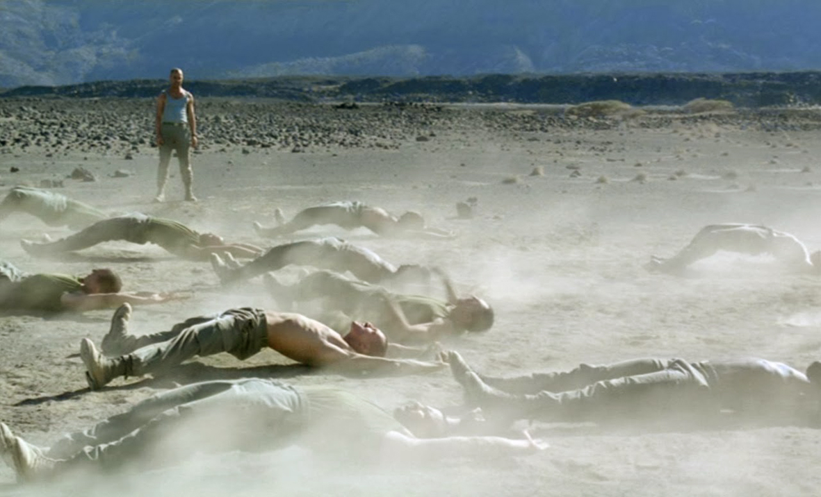 Dla mnie osobiście Piękna praca to obraz ucieczki, przynajmniej na początku. Coś jak skazanie się przez zakonników na życie w klasztorze. W tym przypadku chodzi o legię cudzoziemską i oddalony przyczółek na czarnym lądzie (film był kręcony w Dżibuti). To historia byłego już żołnierza, oficera Galoupa (Denis Lavant) i jego wspomnień dnia codziennego na spalonej słońcem ziemi. Teraz, przechadzając się samotnie francuskimi ulicami, ucieka myślami do żołnierskich rytuałów, zajęć, które wypełniały czas od świtu do zmroku. Wtedy wszystko było inne, prostsze, łatwiejsze. Musztra, ćwiczenia, manewry. Spokój zaburzył nowy rekrut Gilles Sentain (Grégoire Colin, doskonale przeze mnie zapamiętany z jednego z lepszych filmów Agnieszki Holland, Olivier, Olivier), od którego bił magnetyzm. Galoup zazdrosny o jego hart ducha, młodość, siłę witalną (bo sam, jak wspomina w narracji, już rdzewieje) zaczął się… rozpadać. Nigdy na zewnątrz, bo tam Galup wciąż trzymał fason.