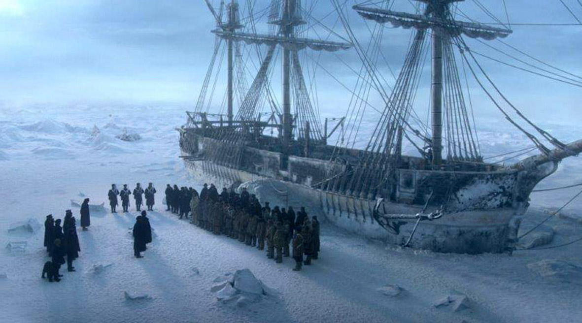 Pierwowzór literacki (o którym jeszcze wspomnę) cechowało niespieszne, acz konsekwentne przedstawianie bohaterów, którzy osuwali się w kierunku własnych cieni. Simmons idealnie prowadził akcję i krok po kroku zbliżał się do finału ani przez chwilę nie zmieniając tempa, co rusz wyprowadzając mocniejsze ciosy w kierunku załogi. W serialu czuć niestety, że telewizyjny format dziesięciu odcinków wymaga sporych skrótów. Nie ma więc moich ulubionych książkowych fragmentów (a które być powinny, nawet w tych czterech odcinkach). Nie czuć też horroru, który na kartach powieści był namacalny. W serialu, jest to trochę obdarte z tajemnicy. Tak jakby twórcy wybierali kilka konkretnych wydarzeń nie pokazując drogi do nich. Akcja jest więc pospieszna (porównując do materiału literackiego, nigdy sama z siebie) i brakuje czasu na wykończenie z ikrą. Ale mimo wszystko udostępniony mi fragment serii w pełni satysfakcjonuje. Kręcony na Węgrzech Terror to bardziej serial przygodowy (na razie), niż serial grozy (chociaż środki formalne wskazują na coś innego). Nie czuć też tego przejmującego zimna na statku, a bądź co bądź jako czytelnik pamiętam doskonale tą nieciekawą sytuację w obrębie drewnianych izb, mało zresztą przytulnych. Na szczęście, atmosfera na zewnątrz i inscenizacja tamtych lodowatych warunków jest świetna.