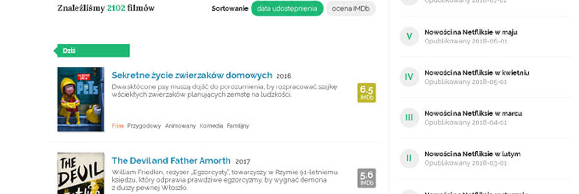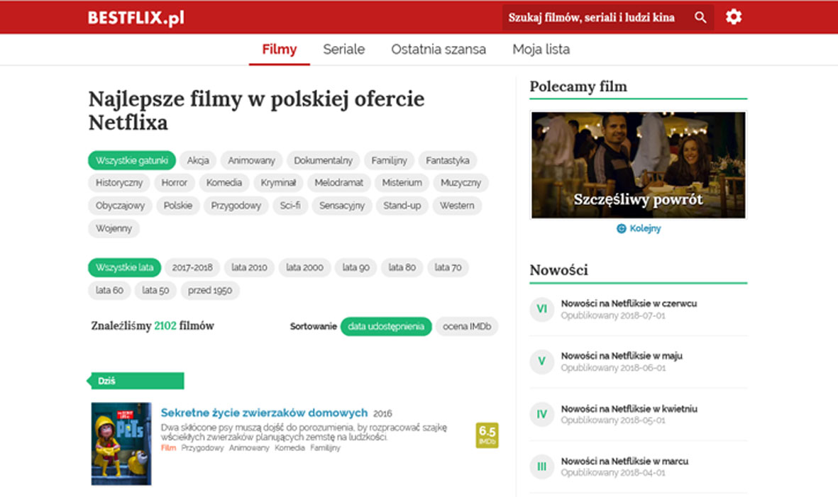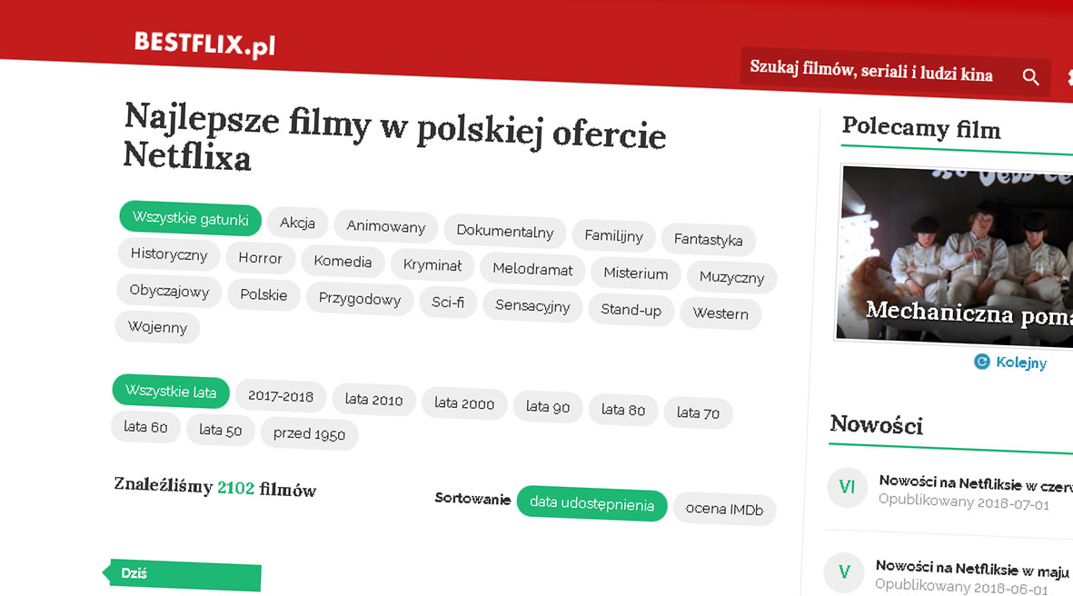 To serwis, który doskonale zbiera tytuły dostępne z oferty Netflix, gdzie przy pomocy kilku kliknięć wyszukasz to, co najbardziej cię interesuje. Podstawą jest tu główna strona, na której dodawane są tytuły według ich pojawiania się na portalu. Nic nie przegapisz, bo rzecz, która wskakuje na Netflix, pojawia się pod DZISIAJ, WCZORAJ itd.