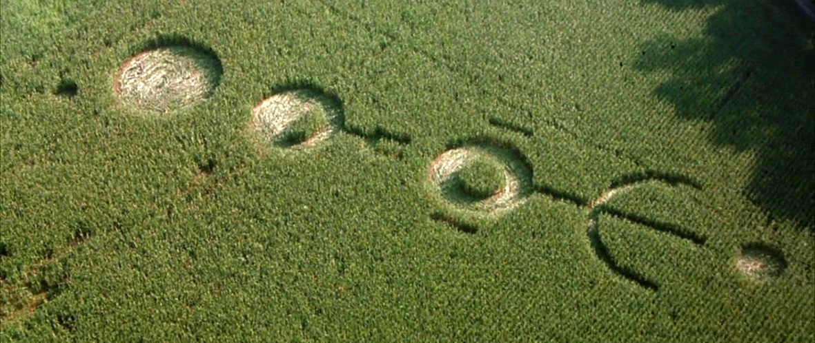 Znaki rozpoczynają się w pogrążonym we wczesnoporannej ciszy domu rodziny Hessów, w sypialni, w której Graham (Mel Gibson) budzi się ze snu, z wyrazem niepokoju na twarzy. Co wywołało u niego to uczucie? Po chwili akcja, wraz głównym bohaterem, przenosi się na należące do Hessów pole kukurydzy, na którym wspomniany ojciec rodziny, wraz z dwójką swoich dzieci – Morganem i Bo (w tych rolach Rory Culkin i Abigail Breslin) i bratem Merillem (Joaquin Phoenix) odkrywają wycięty w zbożu z chirurgiczną precyzją piktogram. Sekwencja kończy się ujęciem z kamery powoli oddalającej się od bohaterów, ukazującym ich jako cztery ciemne punkty, niknące pośród wszechogarniającej, przepastnej przestrzeni.