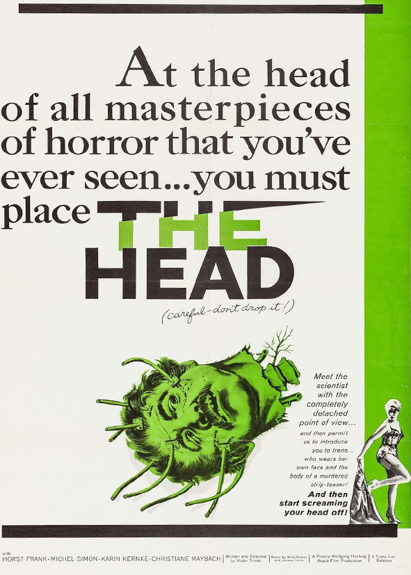 Jeszcze jedna ciekawostka z RFN-u. The Head to makabryczny mariaż horroru i science-fiction – trochę w typie tanich produkcji, jakie w tym samym okresie za Oceanem uprawiał Ed Wood, choć film Trivasa stoi na nieco wyższym poziomie realizacyjnym. Otrzymujemy tutaj standardowe rekwizyty gatunkowe: szalony naukowiec, sprzeczny z etyką eksperyment, pożądanie które pcha ku zbrodni, itd. Podane jest to jednak w zręczny sposób, bez niepotrzebnego obrażania inteligencji widza. Duży plus stanowi również obsada, pośród której bryluje specjalista od ról szumowin, demoniczny Horst Frank. W postać profesora Abla wciela się z kolei weteran Michel Simon, gwiazda francuskiego kina – Simon przyjął propozycję zagrania w tym niekoniecznie nobilitującym projekcie z powodu częściowego paraliżu twarzy i ciała po niefortunnym wypadku na planie poprzedniej produkcji. Propozycje ambitnych ról urwały się, aktor potrzebował więc źródła szybkiego zarobku, jednocześnie przewidując że podobna niskobudżetowa „chałtura” przemknie przez ekrany bez większego echa. Stało się jednak zupełnie inaczej, bo The Head okazało się sporym hitem, który jednak – zgodnie z przewidywaniami – uznanemu aktorowi nie przyniósł wielkiej chluby. Dziś rzecz jest kompletnie zapomniana, choć na tle sztampowego kina grozy z lat 50. wypada wcale świeżo. Miłośnicy klasycznych opowieści z dreszczykiem w każdym razie z pewnością znajdą tutaj coś dla siebie.