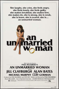 Jedną z reprezentantek nowej kobiecej postaci w kinie została pod koniec lat 70. Jill Clayburgh, a jej rola w Niezamężnej kobiecie Paula Mazursky’ego przedstawia bohaterkę inteligentną, dowcipną, silną kiedy trzeba, ale też, jak się okazuje, bardzo wrażliwą. Łatwo ją zranić. Jest przyzwyczajona do pewnego stanu rzeczy, swobodnie prezentuje idee feministyczne nie nazywając ich jednak takimi. Erica, bo o niej mowa, prowadziła ustatkowane życie żony i matki. Pracuje w galerii sztuki. Rozpracowała życie, ma je doskonale ułożone. Tak się jej do tej pory wydawało, bo jej szanowny małżonek, po 16 latach wspólnego pożycia, ze łzami w oczach informuje ją, że ma kochankę.