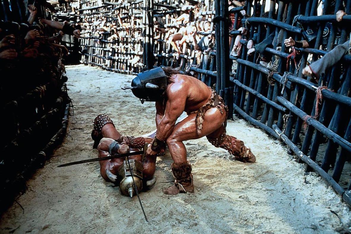 Barbarzyńcy to soczyste heroic fantasy i opowieść o dwóch braciach bliźniakach. Kutchek i Gore (imię niczym pocałunek Deodato dla tego plugawego gatunkowego odszczepieńca), którzy zostali wychowani przez trupę cyrkowych wędrowców. Byli sierotami, ale pod czujnym okiem Canary (nosi tytuł królowej, choć jej „dwór” liczy najwyżej kilkanaście osób) wychowują się w radości i miłości. Jednak Canara ma coś, co jest obiektem pożądania każdego niegodziwca w tej fantastycznej krainie. Magiczny rubin staje się przedmiotem walki, karawana zostaje napadnięta przez zbirów okrutnego Kadara (Richard Lynch zrobiony trochę na Davida Bowiego z Labiryntu Jima Hensona), Kutchek i Gore uprowadzeni, Canara wtrącona do haremu. Po latach, dwóch niemrawych osesków wyrasta na wielkoludów. Wszak nie robili nic innego jak tylko katorżniczą pracę w kamieniołomach, a że jak widać odżywiali się przy tym dobrze, efekty nie mogły być inne. Dwójka bliźniaków będzie zaraz wrzucona na arenę, na której mają walczyć między sobą. Wracają wspomnienia, pojawia się pragnienie krwawego odwetu.
