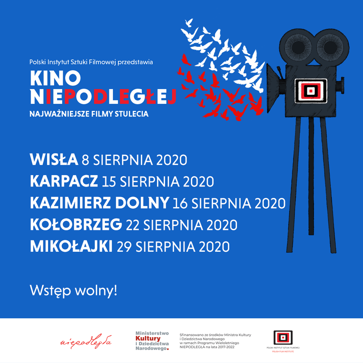 Tegoroczna odsłona cyklu „Kino Niepodległej. Najważniejsze filmy stulecia” wystartuje 8 sierpnia w Wiśle, następnie będzie gościć w Karpaczu, Kazimierzu Dolnym i Kołobrzegu. Na ostatnie wydarzenie w tym roku Polski Instytut Sztuki Filmowej zaprasza do Mikołajek (29 sierpnia). W trakcie pokazów prezentowane będą dzieła najwybitniejszych polskich twórców, m.in. Jerzego Kawalerowicza, Jerzego Skolimowskiego, Kazimierza Kutza, Krzysztofa Zanussiego, Janusza Morgensterna, Jana Jakuba Kolskiego czy Andrzeja Barańskiego. Oprócz filmów fabularnych można zobaczyć także dzieła mistrzów polskiego dokumentu, m.in. Kazimierza Karabasza, Krzysztofa Kieślowskiego i Marcela Łozińskiego. Pokazane zostaną też prawdziwe perły polskiej animacji – filmy Witolda Giersza, Jana Lenicy czy Juliana Józefa Antonisza.