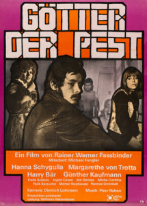 Jak wiele różni Bogów zarazy, trzeciego pełnometrażowego filmu Fassbindera od debiutu i Dziecioroba nakręconego rok wcześniej, widz może przekonać się po kilku raptem minutach seansu. Kamera w ruchu, zmiana perspektywy, inne, bardziej żywe podejście do narracji. Można jeszcze wspomnieć o ujęciach z jadącego auta, z powietrza, zdjęciach (na wyjeździe) w urokliwych plenerach na wsi i kilku innych elementach, które stawiają produkcję Fassbindera w nowym świetle. Twórca samouk ze swoim filmowym studiem Anti-Theater X-Film miał tym razem ponad dwa razy większy budżet i przy 180.000 marek mógł kręcić film dłużej (pięć tygodni na przełomie października i listopada 1969 roku) i zastosować nowatorskie dla siebie sposoby tworzenia. Dużo się więc u Rainer Wernera Fassbindera zmieniło jeżeli chodzi o komfort pracy, ale nie zmieniło się nic jeżeli chodzi o tematykę i tonację.