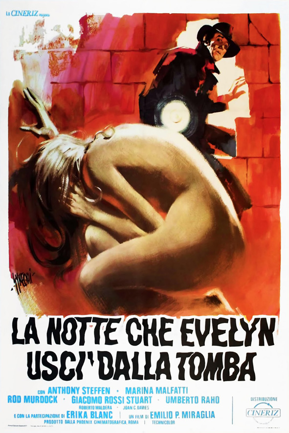 Noc, kiedy Evelyn wyszła z grobu to zwodniczy kryminał i dość intrygujący pomysł, by wywieść widza w pole (nie raz). Delikatna konstrukcja nie raz załamuje się pod naporem pytań, ale niesiony autentyczną ciekawością widz potrafi dość przychylnym okiem spojrzeć na wszystkie fabularne zawirowania i skróty. Duża zasługa w tym stylowych zdjęć Gastone Di Giovanniego i wspaniałej muzyki włoskiego kompozytora Bruno Nicolaia. Motyw przewodni z Noc, kiedy Evelyn wyszła z grobu to już u mnie szlagier, który przepięknie komponuje się z nieco odrealnioną miejscami akcją. Powracające w obrazach dramatyczne przeżycia lorda Cunninghama mają w sobie dużo poetyki, a w swojej stylistyce przypomniały mi późniejszy utwór mistrza Mario Bavy Lisa and the Devil. Być może Cecilio Paniagua, autor zdjęć Lisy zgarnął kilka pomysłów od Giovanniego. Nie można również zapomnieć o głównym aspekcie, z którym powinno wiązać się dobre giallo przede wszystkim, czyli piękne aktorki. Tych jest tu bez liku, a wypada wspomnieć chociażby główną rolę, która przypadła pięknej Marinie Malfatti (zagrała również w drugim giallo Miraglii). Oprócz niej na ekranie możemy podziwiać doświadczoną Erikę Blanc. Niestety jest tak, że niekiedy za urodą nie idzie w parze talent, bo przy niektórych zagraniach aktorów przydałoby się kilka dokrętek.