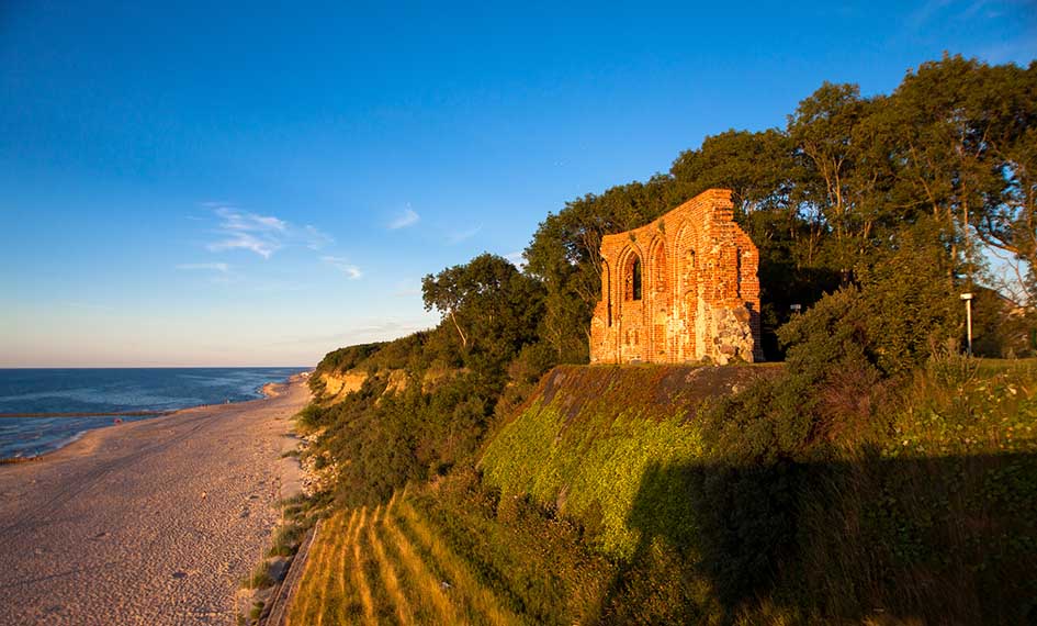 Choć w momencie powstania, w piętnastym wieku, kościół znajdował się około dwa kilometry od brzegu klifu, siły natury stopniowo, lecz konsekwentnie go doń przybliżały. Na przestrzeni około trzystu lat odległość ta zmniejszyła się do pięćdziesięciu ośmiu metrów; wówczas też, w połowie osiemnastego wieku, po raz pierwszy próbowano stawić czoła mocy żywiołu, tworząc konstrukcję z mat z faszyny oraz pali ochronnych. To nie powstrzymało jednak morza przed odbieraniem kolejnych połaci terenu: trzech gospodarstw, znajdujących się pomiędzy brzegiem a Kościołem, a także części znajdującego się nieopodal cmentarza. Sztormy, do spółki z piorunami, nie oszczędzały także dobudowanej w siedemnastym wieku wieży, którą ostatecznie rozebrano z powodu znacznych zniszczeń. Kiedy, w 1868 roku, kościół znajdował się już zaledwie jeden metr od brzegu, zamurowano okna od północnej strony, groźny huk morza zagłuszał bowiem odprawiane nabożeństwa. Wówczas stało się już jasne, iż świątyni nie będzie się dało uratować i że, prędzej czy później, jej kolejne fragmenty (pierwszy z nich upadł w roku 1990) muszą pochłonąć sztormowe fale; podjęto decyzję o wybudowaniu nowego kościoła oraz przeniesieniu zabytkowego wyposażenia do Katedry w Kamieniu Pomorskim oraz kilku muzeów. Pozostało już tylko odprawić ostatnią mszę.