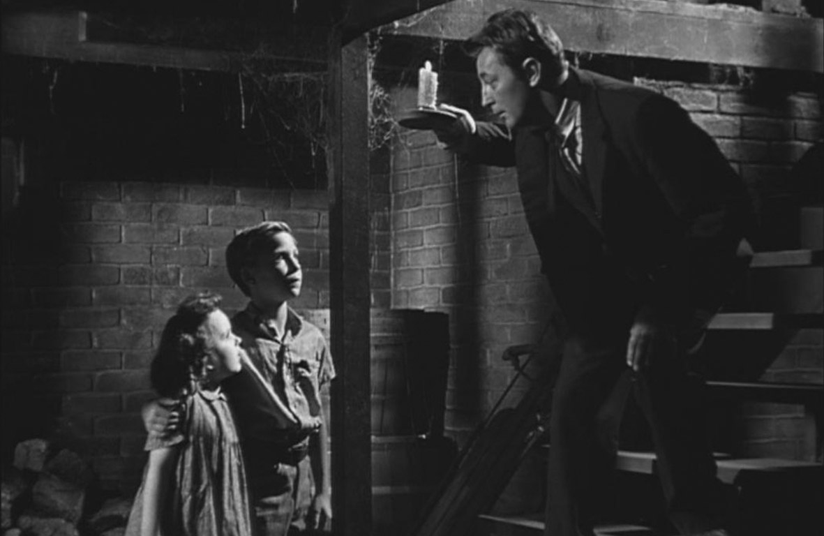 Ta historia porywa widza od początku. Ważne jest tło czyli czas Wielkiego Kryzysu, który zmusza ojca dwójki dzieci do dramatycznych kroków. Ten sam Wielki Kryzys stworzył pośrednio takie persony jak kaznodzieja, który podróżując wzdłuż rzeki Ohio, wyszukiwał okazji do ożenku, a później przejęcia majątku po uprzednim zamordowaniu wpatrzonej w niego kobiety.