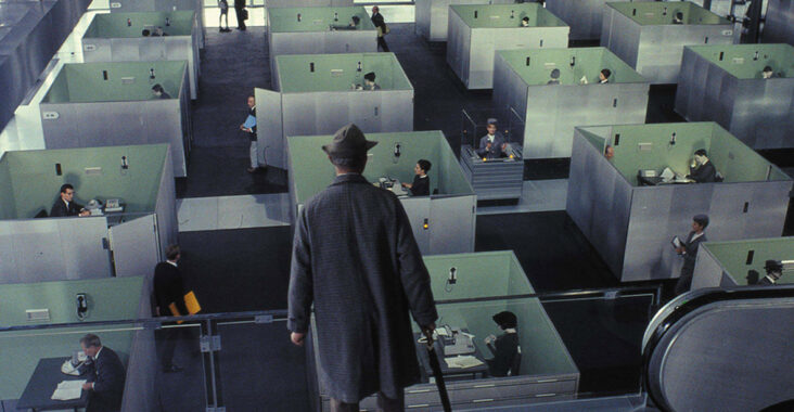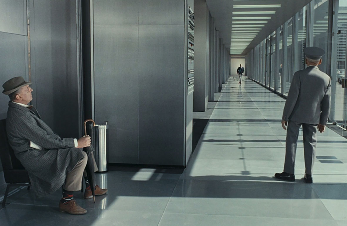 Opowieść u Jacquesa Tatiego dotyczy wprawdzie pana Hulot, ale tak naprawdę mamy tu bohatera zbiorowego, całą rzeszę ludzi biorących udział w najprzeróżniejszych codziennych czynnościach. Tak, pan Hulot jest niczym wirus, wchodzi w doskonale działający organizm, przewraca komórki, wchodzi tam gdzie nie powinien i popycha ten jeden kluczowy kafelek domino. Ten doskonale działający organizm to miasto, biurowce, korporacja z wyglancowanymi na wysoki połysk podłogami. Do takiego świata wchodzi pan Hulot, który pragnie załatwić jakąś sprawę. Jaką? Nieważne, nie dowiemy się tego.