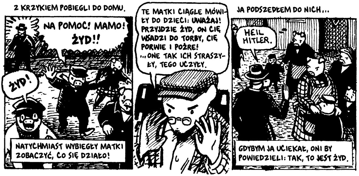 Sfera obyczajowa, czyli życie w Stanach Zjednoczonych, problemy dnia codziennego, problem z opieką nad Władkiem, ciągłe utarczki, mniejsze i większe kłótnie przeplatają się z wspomnieniami o Holokauście. Sposób prowadzenia narracji uwidacznia geniusz Arta Spiegelmana. Czasy współczesne, czyli czasy przed powstaniem komiksu wiążą się ściśle z latami wojennymi. Uświadamiamy sobie, jak doświadczenia obozowe mogą w różny sposób wpłynąć na człowieka. Każdy jeden przypadek nadaje się do opowiedzenia. Przypadek Władka nie jest jakiś szczególny, ale komiksowe medium pokazało wymiar niezwykle ludzki tej historii. Władek bowiem nie jest kimś niezwykłym. Jest bardzo irytujący, trudno z nim wytrzymać, jest ogromnym ciężarem dla bliskich. Jest zwykłym człowiekiem, był w Auschwitz, jest straumatyzowany, ale przeżył i już samo to nadaje sprawie kształt sprawy nadludzkiej.