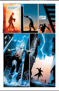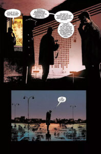 Jednoręki i Sześć palców to przede wszystkim mroczny i bezkompromisowy thriller w estetyce cyberpunka i sci-fi pokroju Matrixa. Czyli jednak cyberpunk? I tak, i nie, bo Iednoręki i Sześć palców wyraża swój charakter poprzez nietuzinkowe ujęcie narracji. Na tym polu to mistrzostwo, śledztwo prowadzone przez gliniarza w pomiętym prochowcu i perspektywa zabójcy jest traktowana równorzędnie. To mistrzowski zabieg (za chwilę o nim dokładniej), dla mnie absolutnie spektakularny w komiksowym medium. Z pewnością ten motyw nie jest opatentowany i być może znacie podobne przypadki, ja jednak byłem całkowicie zaskoczony pomysłem rozbicia narracji na dwóch scenarzystów i dwóch rysowników. Tak, komiks to przeważnie praca zbiorowa, ale ta tutaj wchodzi na inny poziom.