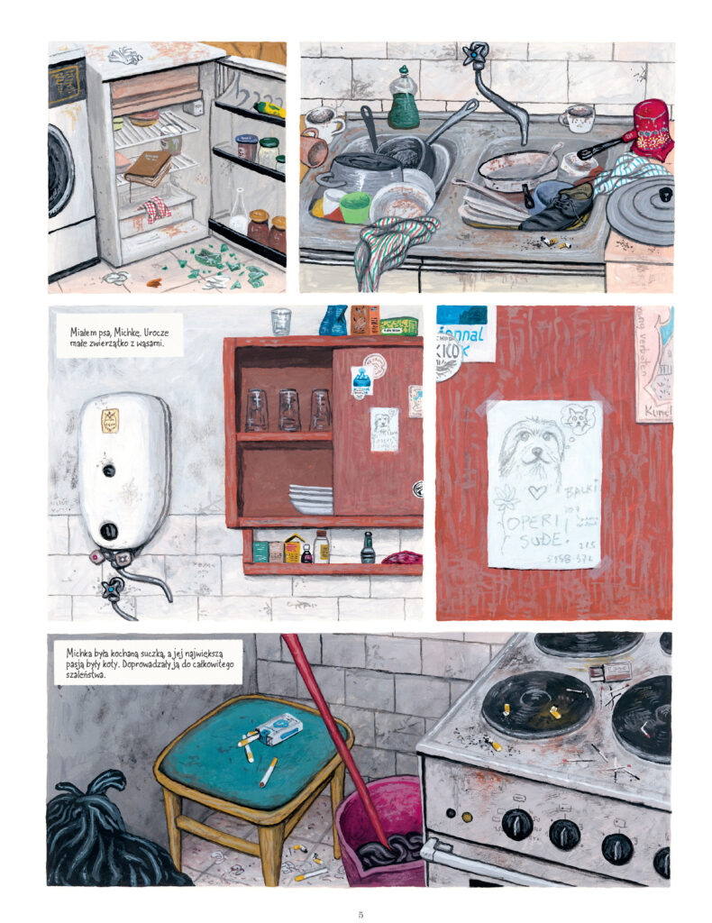 Komiks chorwackiego artysty Miroslava Sekulic-Strui jest wybitny, wizualnie dość wymagający. Dla mnie nieco awangardowy, ale po pierwszych planszach byłem już zachwycony. Stylem przypomina mi trochę prace Nikifora (trochę!). Trzeba się wczuć, odkrywać tła, emocje. Językowo jest doskonały, słowem uderza nieco w uliczną poetykę. Miałem skojarzenia z prozą Doroty Masłowskiej, którą szczerze uwielbiam. Niektórzy już to zdążyli zauważyć. Natomiast scenariusz to już bardzo mocna i przejmująca podróż. Krążymy wokół historii mężczyzny z połamanym życiorysem. Kluczowym motywem jest miłość, ale ta sama miłość zakwitła na wyjątkowo mało urodzajnej glebie. Jest tam dużo smutku, jest i choroba psychiczna (ważny aspekt), a w tle demony.