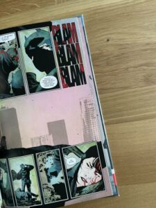 To, z czym miałem problem to sam format komiksu. Sorrentino wypełniła każdą stronę wieloma szczegółami, niekiedy kadry są bardzo malutkie, a że jest tu kilka patentów które zajmują raptem centymetr lub dwa, ciężko je w pełni docenić. Jest chociażby ten motyw, w czasie walki, gdy Batman łamie jakieś kończyny i te szczegóły są kadrowane osobno. Widziałem ten motyw w kinie, sprawdza to się lepiej na wielkim ekranie. Tutaj gra to na tym patencie, że efekt jest rysowany na osobnym kadrze, czarno białej miniaturze. Cóż, bardzo małej miniaturze.