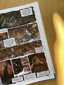 Dobra solidna robota, Sarna fajnie operuje pędzelkiem w scenach nocnych, przykuwa uwagę zabawa światłem w momentach gdy Tomek razem z dziewczyną (tak, musiał znaleźć się taki wątek, na poły szczeniacko romantyczny, bardzo pasujący do opowieści) używają latarek. Dobrze to wygląda na planszach. Być może jest ten komiks nieco przeładowany tekstem, ale z drugiej strony trudno mi sobie wyobrazić zrezygnowanie z czegoś, tutaj trzeba sporo wyjaśnić w kontekście scenariusza, motywów, historii.