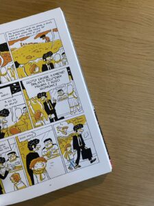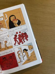 Dla mnie Ja, Fadi. Porwany brat przez pierwszą połowę to thriller, później wchodzi prawdziwy dramat. Riad Sattouf wprowadza pomysł, którego przy Arabie przyszłości (jestem po pierwszym albumie) nie było. Otóż, gdy sceny są naprawdę gwałtowne, gdy napięcie podskakuje pod sufit, Sattouf wykorzystuje czerwień jako główną barwę w kadrze. Kolor kojarzy się tylko z czymś złym, agresywnym. Tutaj mamy całkiem sporo takich momentów. I to już świadczy niejako o charakterze komiksu.