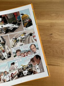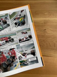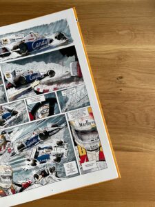 Mamy więc przegląd kariery i do tego w mocno wybiórczym kolażu. Oczywiście 46 stron nie nadaje się do umieszczenia na nich biografii i to takiej sportowej legendy. Wierzę, że Lionel Froissart, scenarzysta albumu, bił się z myślami, które kluczowe fragmenty umieścić w komiksie. Dostaliśmy więc trochę z młodszych lat Brazylijczyka, gdy był już dostrzegany na torach kartingowych. To tam pokazał się jako ten, który nic sobie nie robi z jazdy w trudnych warunkach pogodowych. Później prześledzimy jego karierę robiąc przystanki przy kilku datach i kilku wyścigach. Estoril, 20 stycznia 1994 roku. Przeskok na Silverstone, w niedzielę 16 lipca 1983 roku, Jest też Sao Paolo, w 1991 roku, czyli Grand Prix Brazylii oraz kilka innych miejsc i dat.