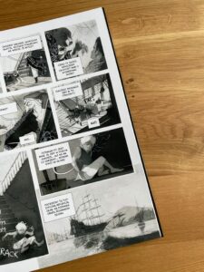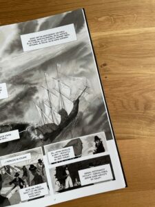 Corbettini w tym albumie operuje tylko czernią. Te ilustracje, rysunek marynistyczny, są imponujące. Nie tylko, bo w połączeniu z tak fantastycznie odwzorowanym morskim żywiołem, to jedna z bardziej spektakularnych prac jakie ostatnio widziałem. Pisząc szerzej mam tu na myśli ilustracje w stylu malarskim, gdzie rysunki okrętów (przy ich szczegółach) są ściśle związane z całym tłem, zarówno z pejzażem morskim, jak i z niebem. To nieustannie przenika, a czerń i biel przy niebywałym opanowaniu gradientu w pełnej rozpiętości robi ogromne wrażenie.