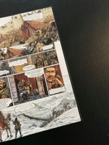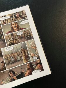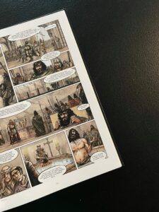 Dla mnie to nie jest ani szczególnie interesujący historycznie okres, ale też nie jest to szczególnie porywający komiks. Rysunek Gwendala Lemerciera jest poprawny, solidny, żaden kadr nie zostanie jednak ze mną na dłużej. Jest tu też pewien problem z perspektywą (sceny w łaźni). Całość to głównie gadające głowy, ilustracje lepiej wypadają gdy mamy pejzaż, miasta, większe skupisko ludzi. W tych momentach mogłem docenić dbałość o detale (stroje, architektura). Brak tu jednak większych scen bitewnych, tak jakby Lemercier bał się trochę wejść w ten temat, albo po prostu scenariusz Clotildy Bruneau i Vincenta Delmasa nie pozwalał na nic więcej.