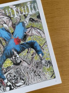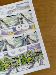A co do warstwy graficznej? Cóż, jest bardzo specyficzna. Trzeba się do niej przyzwyczaić (pokochać, lub nie). Marek Kopiec i Grzegorz Kopiec (kolorysta) przedstawili swój świat przy pomocy oszczędnych rysunków. Wyróżniają się białe powierzchnie, kolory są bardzo wyraźne, dominują podstawowe barwy. Często musiałem też przypatrzeć się przy tych większych planszach, gdy autor postanowił zagęścić akcję. Fanem stylu nie zostanę, ale doceniam mocne kontrasty, rysunek postaci i szanuję za to, że komiks ma przez to swoją oryginalną formę.