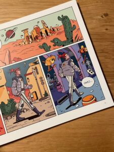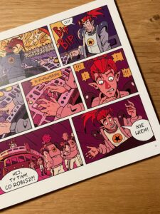 Zrobiło na mnie ogromne wrażenie to, z jaką gracją Katarzyna Kubasik, artystka w pełni odpowiedzialna za komiks Starventure, porusza się w tej z góry narzuconej przez siebie estetyce. Otóż Katarzyna Kubasik zdecydowała się połączyć w komiksie gatunek science-fiction z komedią i przygodą. Jej Starventure wyrasta z pewnego luzu, jest wypełnione świetnymi pomysłami, a ja czułem się trochę jak wtedy, gdy Tytus, Romek i A’Tomek w księdze XIII odwiedzali wyspy Nonsensu. Podobny vibe, a u Katarzyny Kubasik musiał wybuchnąć podobny kreatywny wulkan jak wtedy u Papcia Chmiela. Nie jestem pewny, czy autorka życzyłaby sobie takich porównań, ale nic na to nie poradzę. Jak się uczepię własnych przemyśleń, to ciężko mi odpuścić.