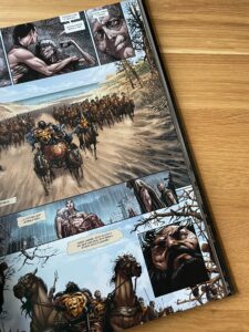 Najwięcej emocji (w obu przypadkach) dostarczają te gwałtowne sekwencje, akcja, pojedynki, gdy wydarzenia mkną na złamanie karku. Gdy czytelnik przypatrzy się szczegółom, jest czasem gorzej. Choćby te rozbudowane muskulatury, nieznane nauce fragmenty anatomii i tak dalej. Z drugiej strony, to przecież komiks fantasy, ma być z przytupem (w kilku elementach) również pod kątem graficznym. Całość wygrywa przede wszystkim ponurym nastrojem, również w ilustracjach.