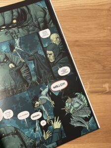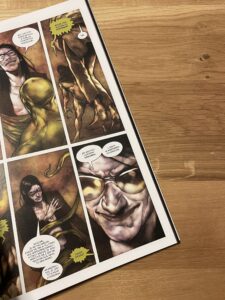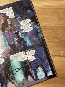 Dla mnie to największy atut, któremu łatwo przypisać jednocześnie określenie „chaotyczny”. Tak, zbiorcze wydanie, biorąc pod uwagę styl rysunków, jest chaotyczne. Ten sam chaos pasuje do treści (bogowie, wojna, ciągłe przepychanki, jak ma nie być chaotycznie?) i daje to fantastyczny pogląd na warsztat różnych twórców. Zatem traktujcie ten album jak komiks niespodziankę, pudełko z czekoladkami, każdy epizod jest narysowany w innym stylu, ciągle przy kontynuowaniu wątków. Przez to bohaterowie będą również wyglądać inaczej. U mnie wpłynęło to pozytywnie na odbiór. Zatem jednorodna estetyka nie istnieje. Realistyczna i dość klasyczna kreska Marka Harrisona zaraz zamieni się w ekspresyjne i pełne barw wizualia w drugim epizodzie. I tak dalej. Graficzna różnorodność wzmaga więc doznania.