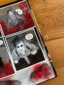 Simmonds bowiem tworzy ilustracje, które nie tyle przedstawiają wydarzenia, ile budują nastrój. To on jest tutaj głównym nosicielem narracji. Malarska ekspresją artysty, zniekształcenia, rozmycia, chropawe niedoskonałości, wyciąganie ostrości z istotnych elementów horroru (oczy, szpony, kły), to wszystko sprawia, że grozę i horror odczytuje się na zasadzie przyswajania tych pięknych i mrocznych, przenikających się krwistoczerwonych czasem brudnych rozlewisk.