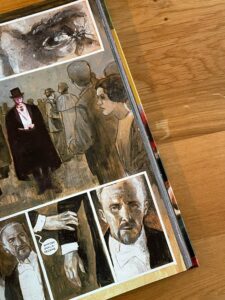 Zatem solidnie scenariuszowo, z mocnym patentem z figurą wampira jako postacią, która jest, ale zawsze w cieniu i zawsze gotowa do ataku (jak rasowy drapieżnik) i z przepięknym podejściem do epickiej krwawej grozy, gdzie każda plansza stanowi przykład gotowego, przygotowanego wydruku pod do antyrame, którą można zawiesić w klimatycznej zaaranżowanej na styl gotycki knajpie.