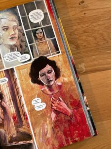 Ta malarsko-kolażowa estetyka, która urzeka od pierwszej planszy jest jak rozlany na papierze strach. Tu nie będzie granicy w kolorze, wszystko działa jak rozprysk tak barwy jak i emocji. Rysunki Martina Simmondsa nadają ton opowieści i wydaje mi się, że James Tynion IV jest tu raczej gościem jako scenarzysta. Zaznacza jakie postaci mają być kluczowe, dobrze w tekście oddaje chaos, przerażenie, ale jednocześnie coś uwodzicielskiego. I jest jednocześnie autorem jednego świetnego patentu, o nim za chwilę. Dominuje tutaj jednak ilustracja, bo Simmonds zdaje się być panem i władcą plansz.